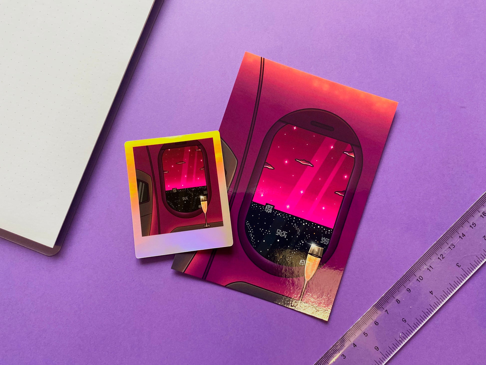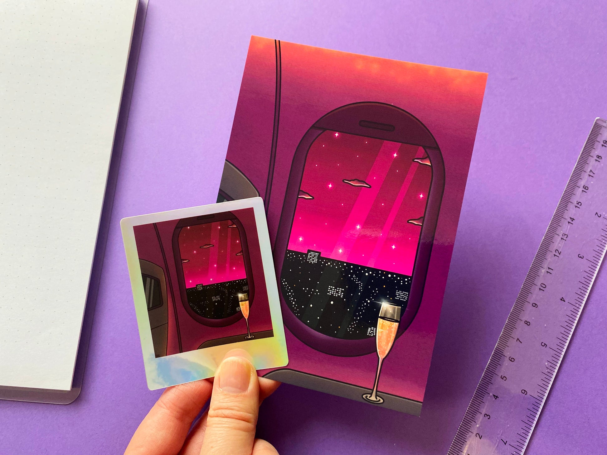 Art print representing a late night city view in a plane, dreamy and vaporwave atmosphere. This print can also be used as an A5 postcard.