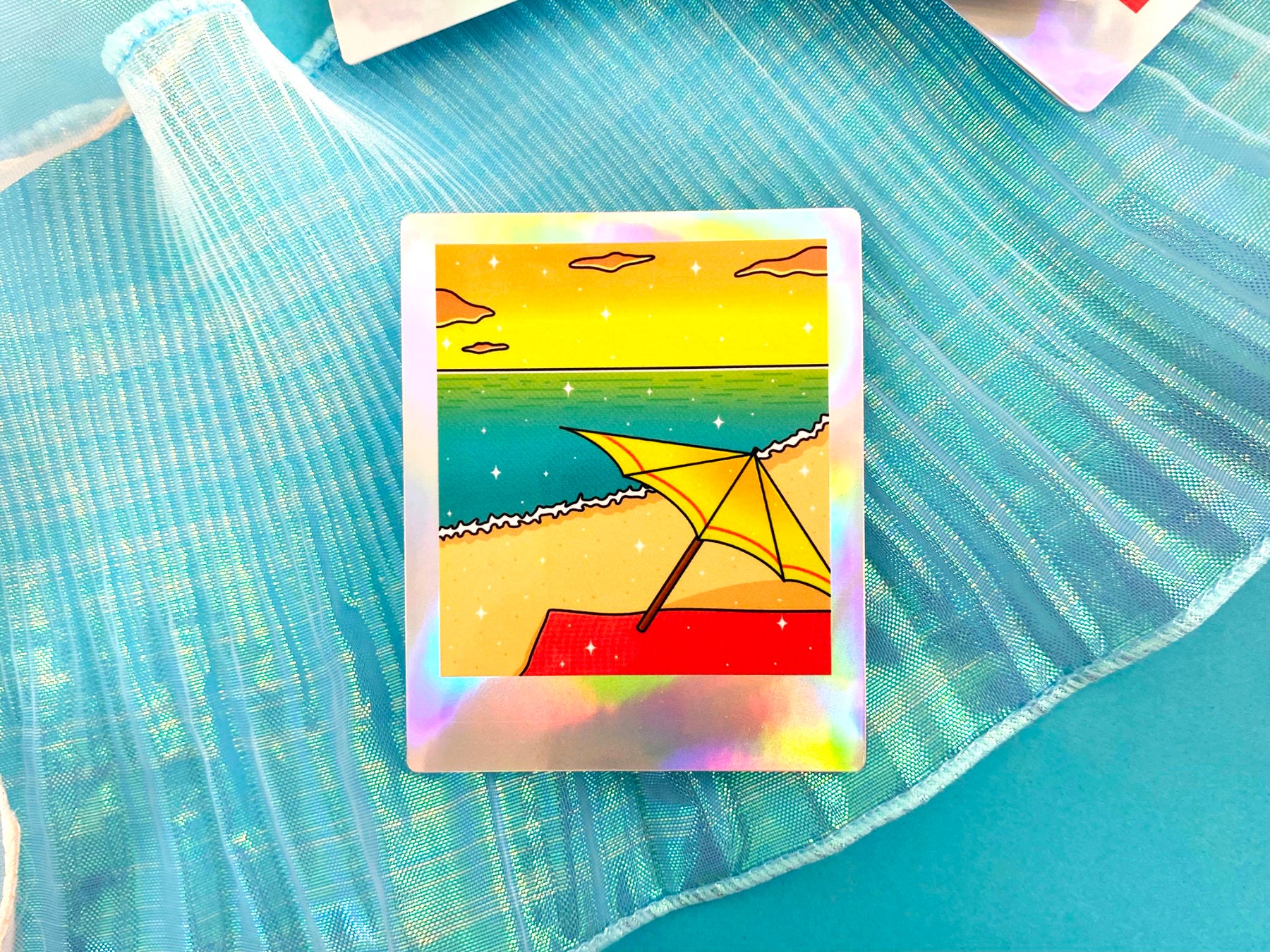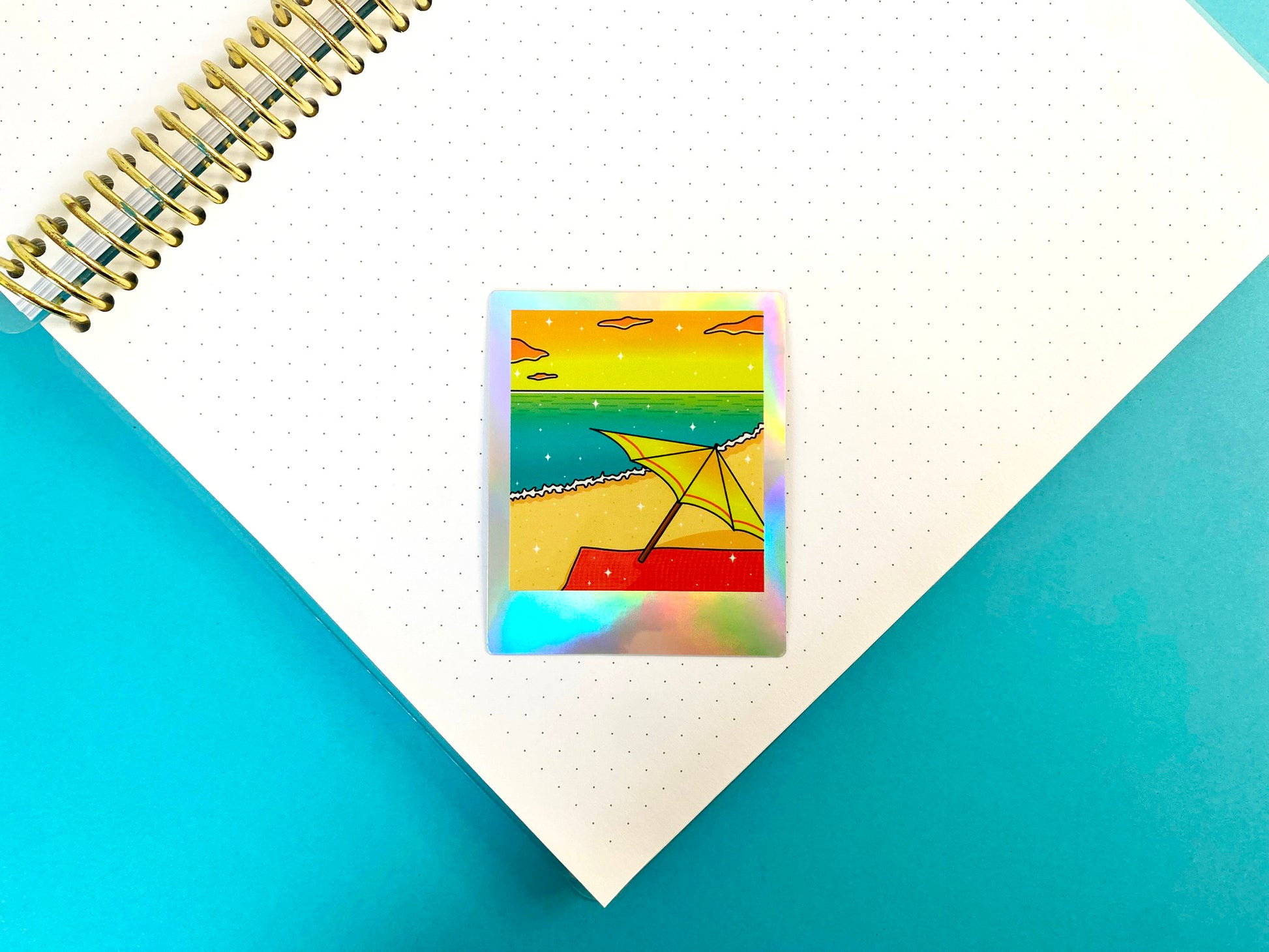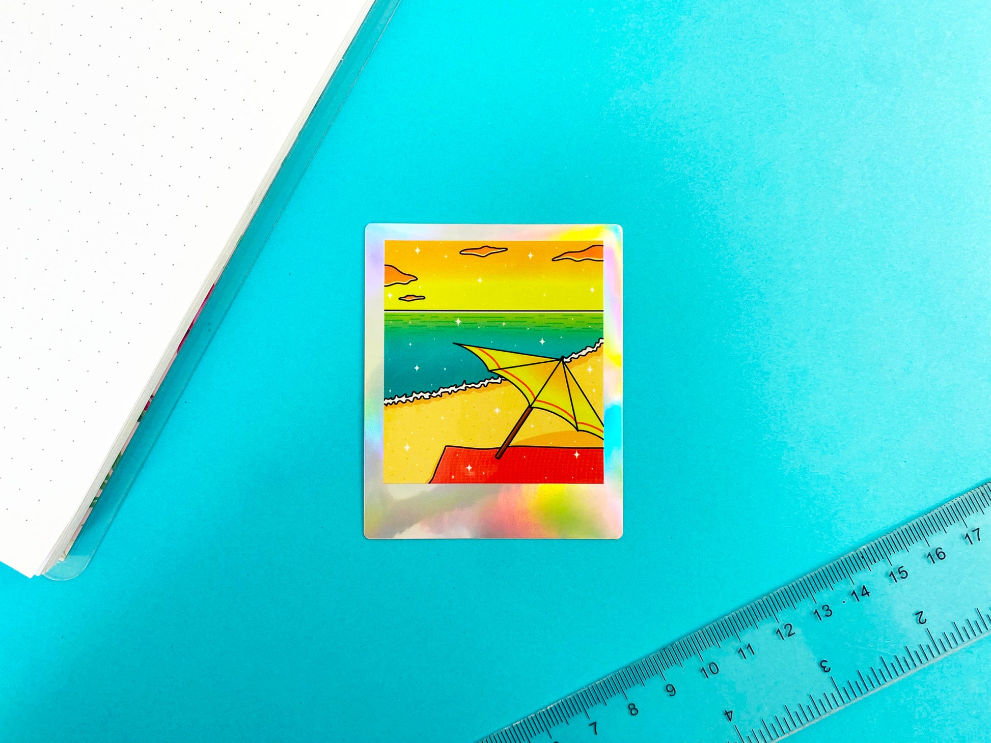 Hot Summer Collection – Polaroid "Beach time" Holographic Sticker. After a gentle swim, it's time to relax and sunbathe in the best spot on the beach.