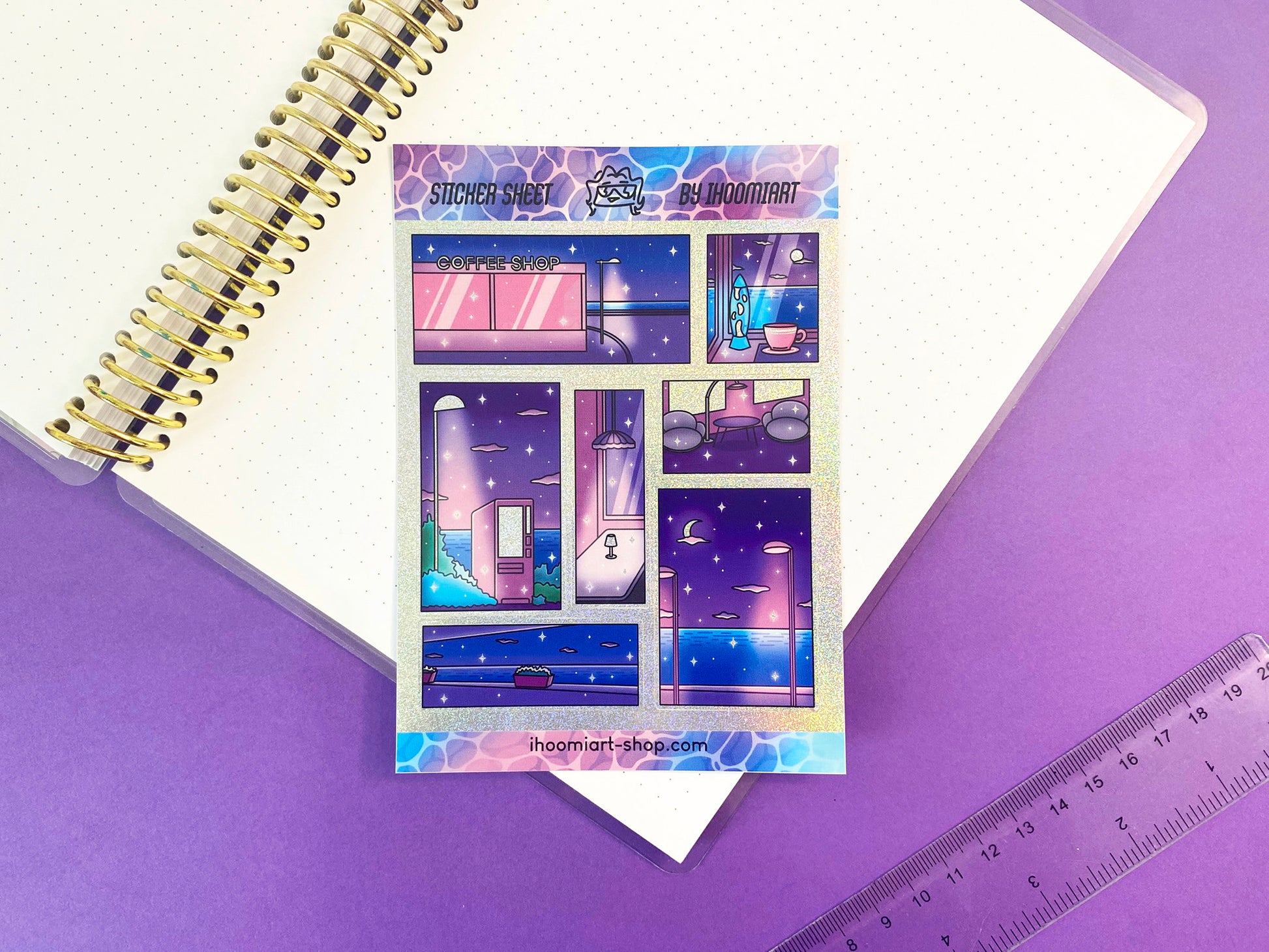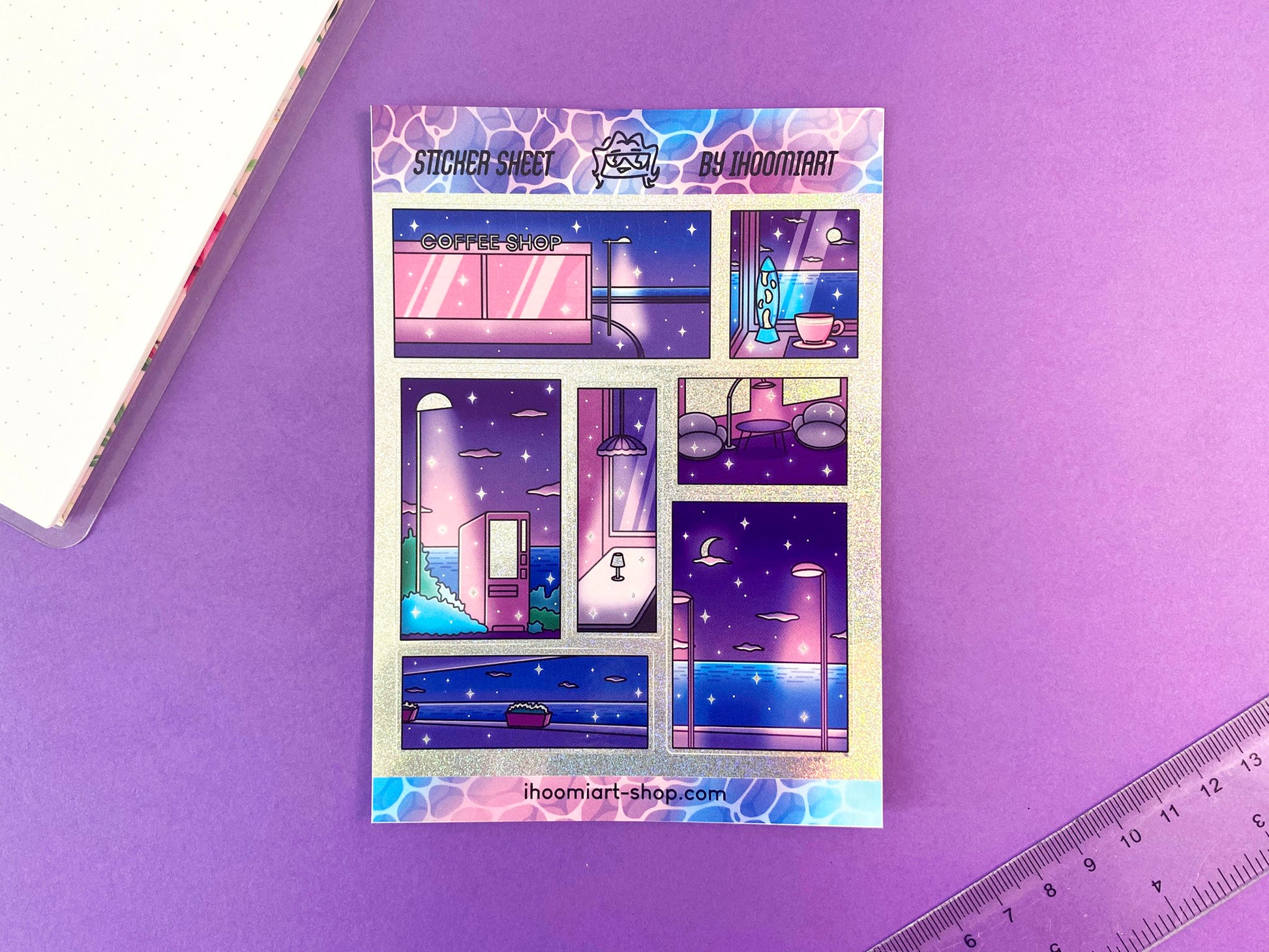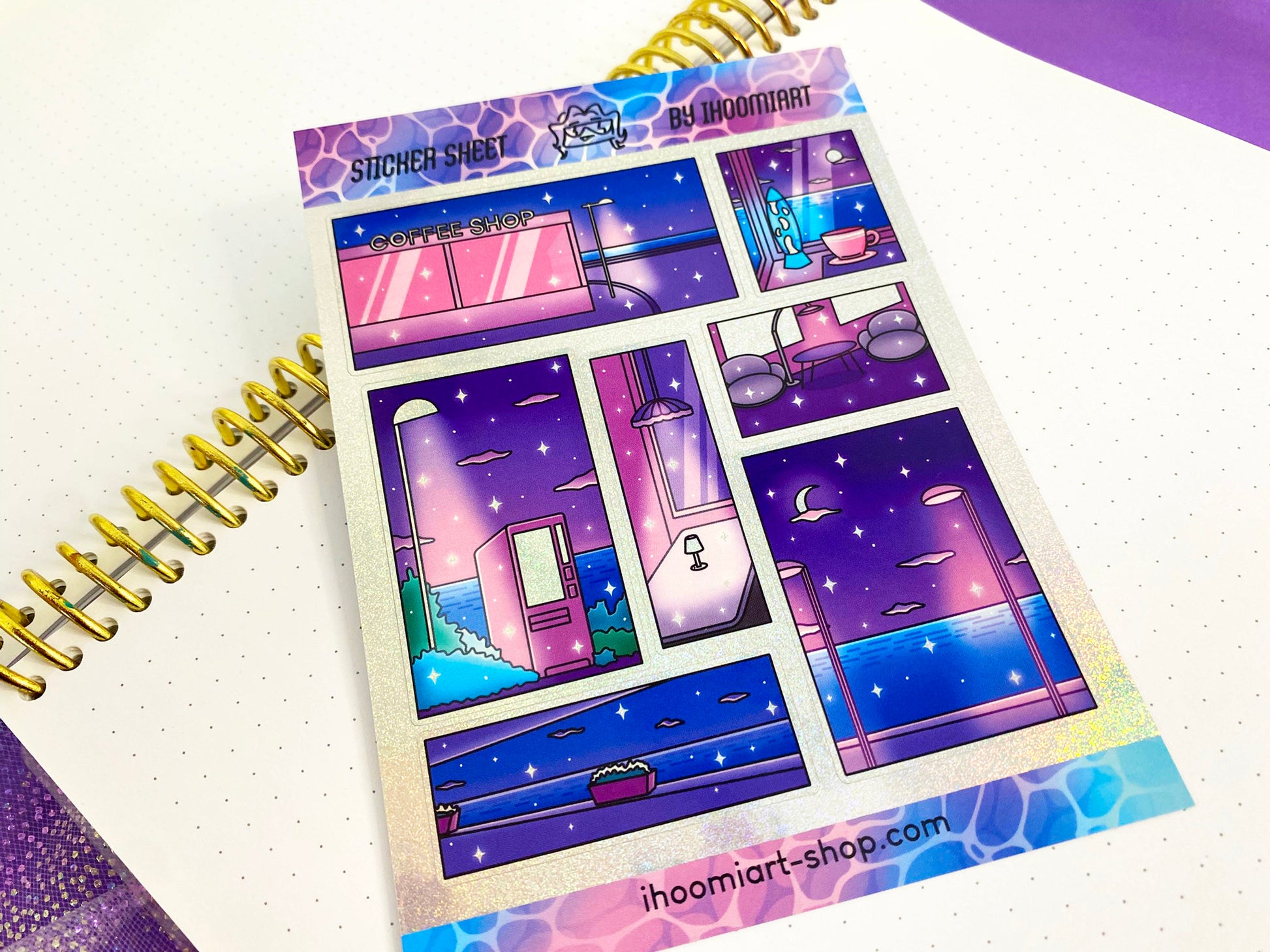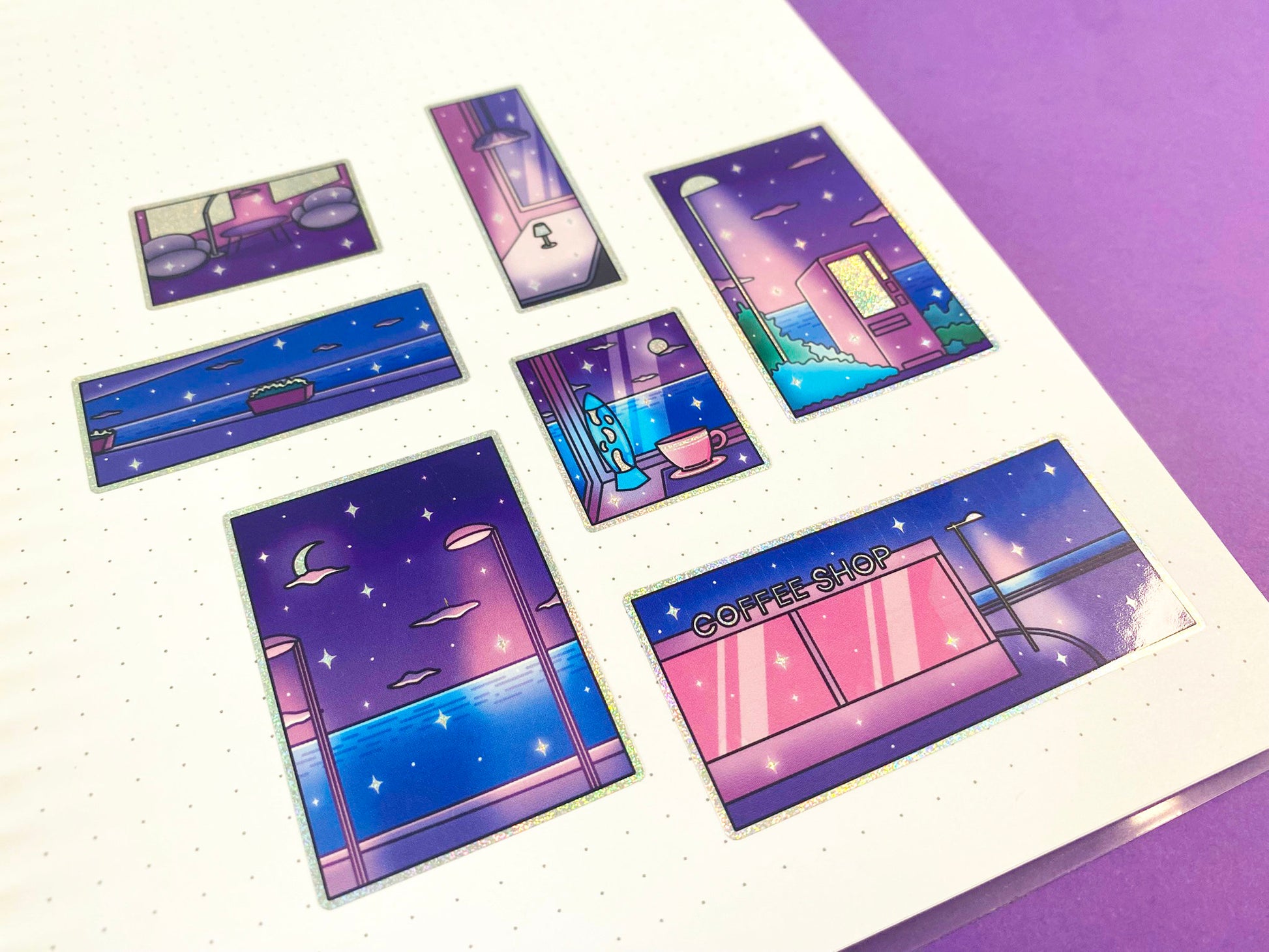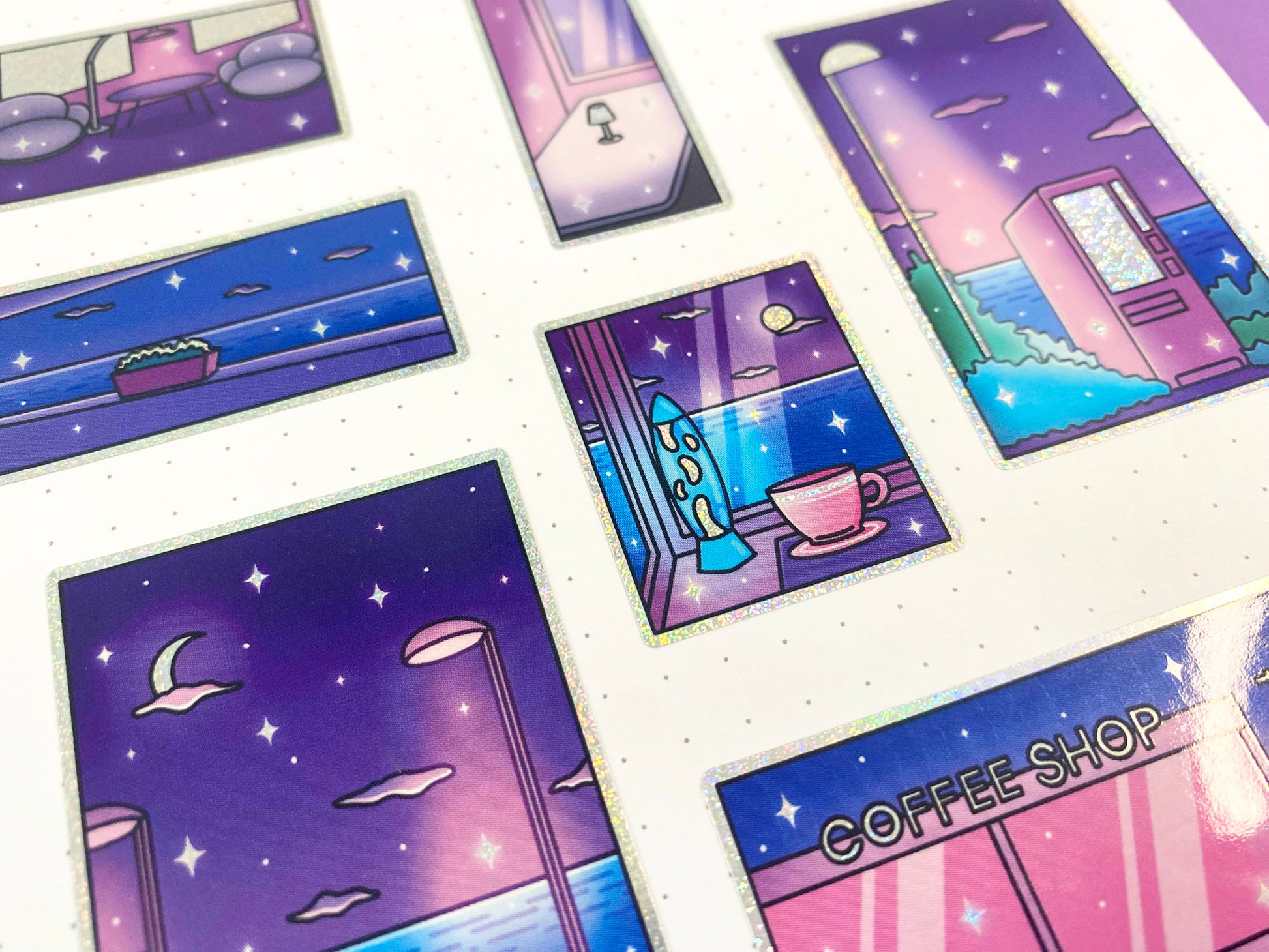 Late Night Collection – Holographic Sticker Sheet Night Walk Scenes. A peaceful stroll along the seaside, drinking a coffee in your favorite coffee shop, grabbing a snack from the vending machine before heading home... The atmosphere is always different in the middle of the night.