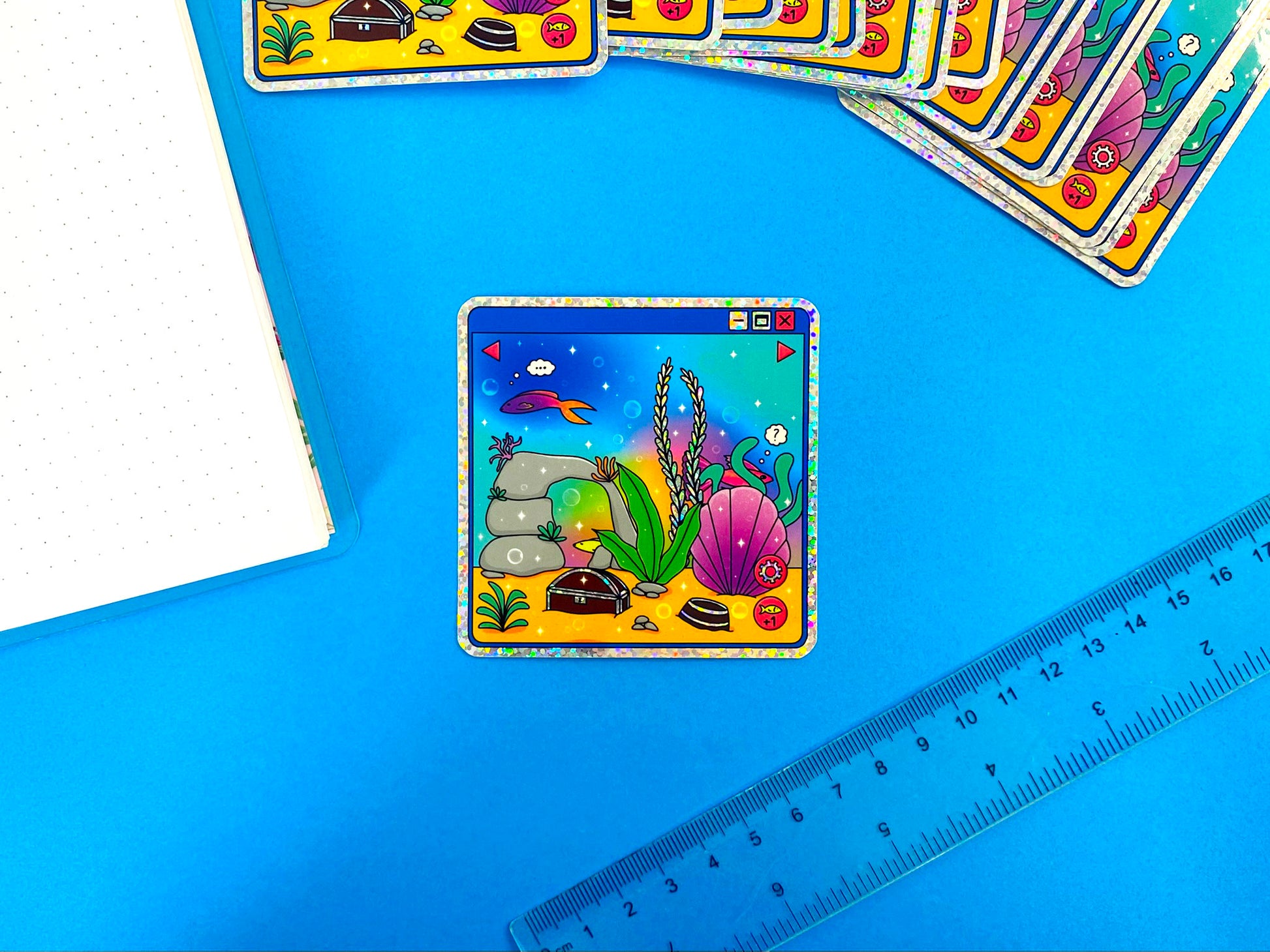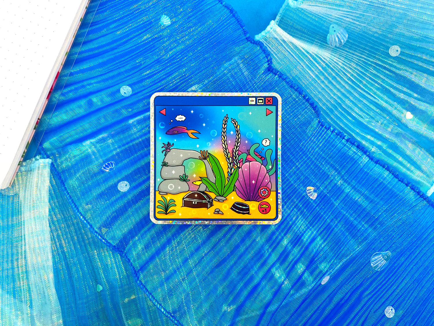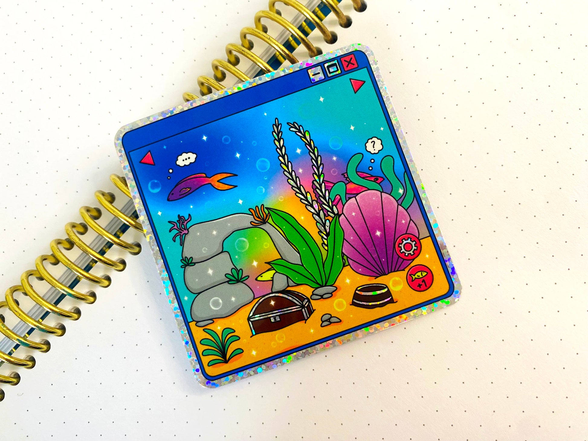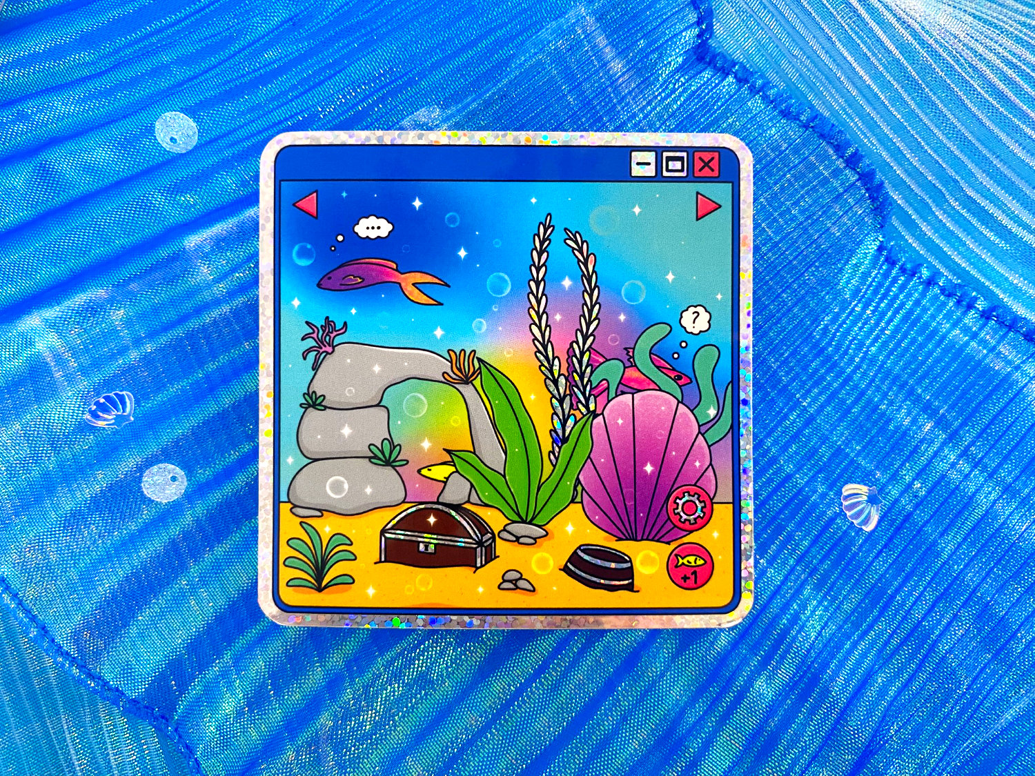 Nostalgic Fish – Virtual Aquarium Holographic Glitters Sticker. An open window with your little virtual aquarium. The fish swim quietly and endlessly, interacting with the colorful scenery.