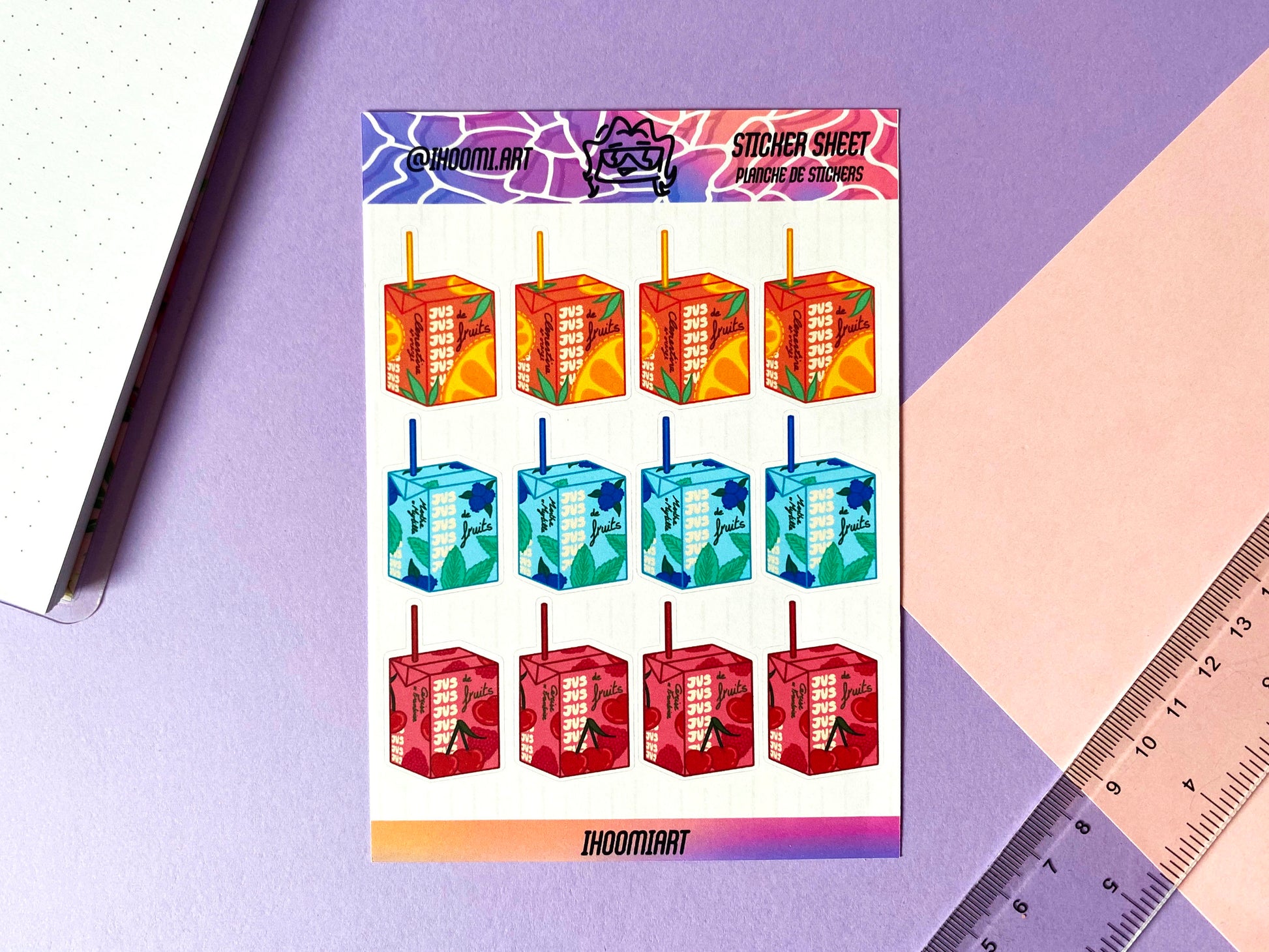 Sheet of stickers of cute, kawaii and colorful fruit juice bricks. Ideal for scrapbooking, bullet journal, journaling, notebook; etc.