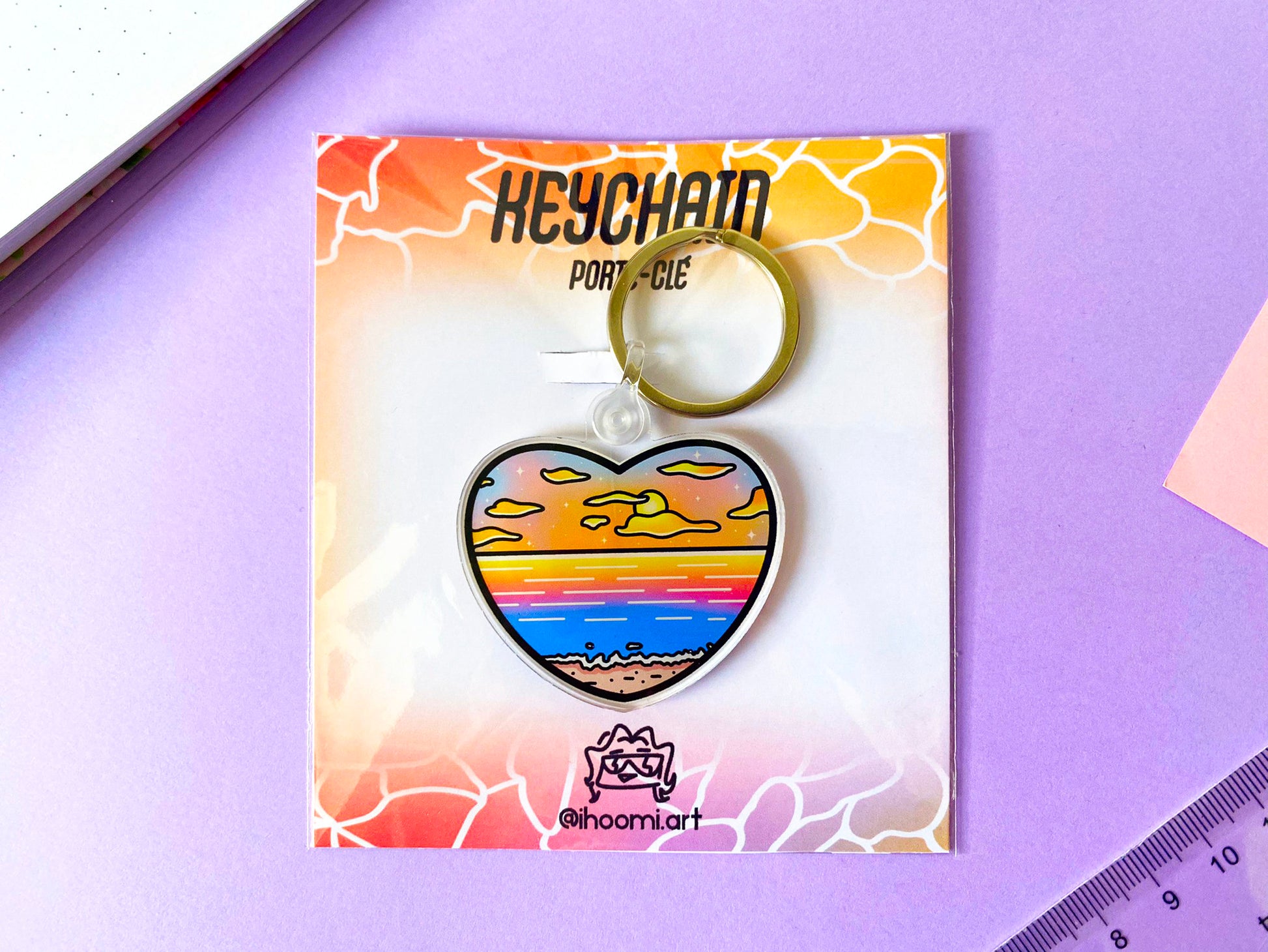 Aesthetic vaporwave dreamy & cute heart keychain | Sunset ocean view landscape key ring | Acrylic heart charm keychain