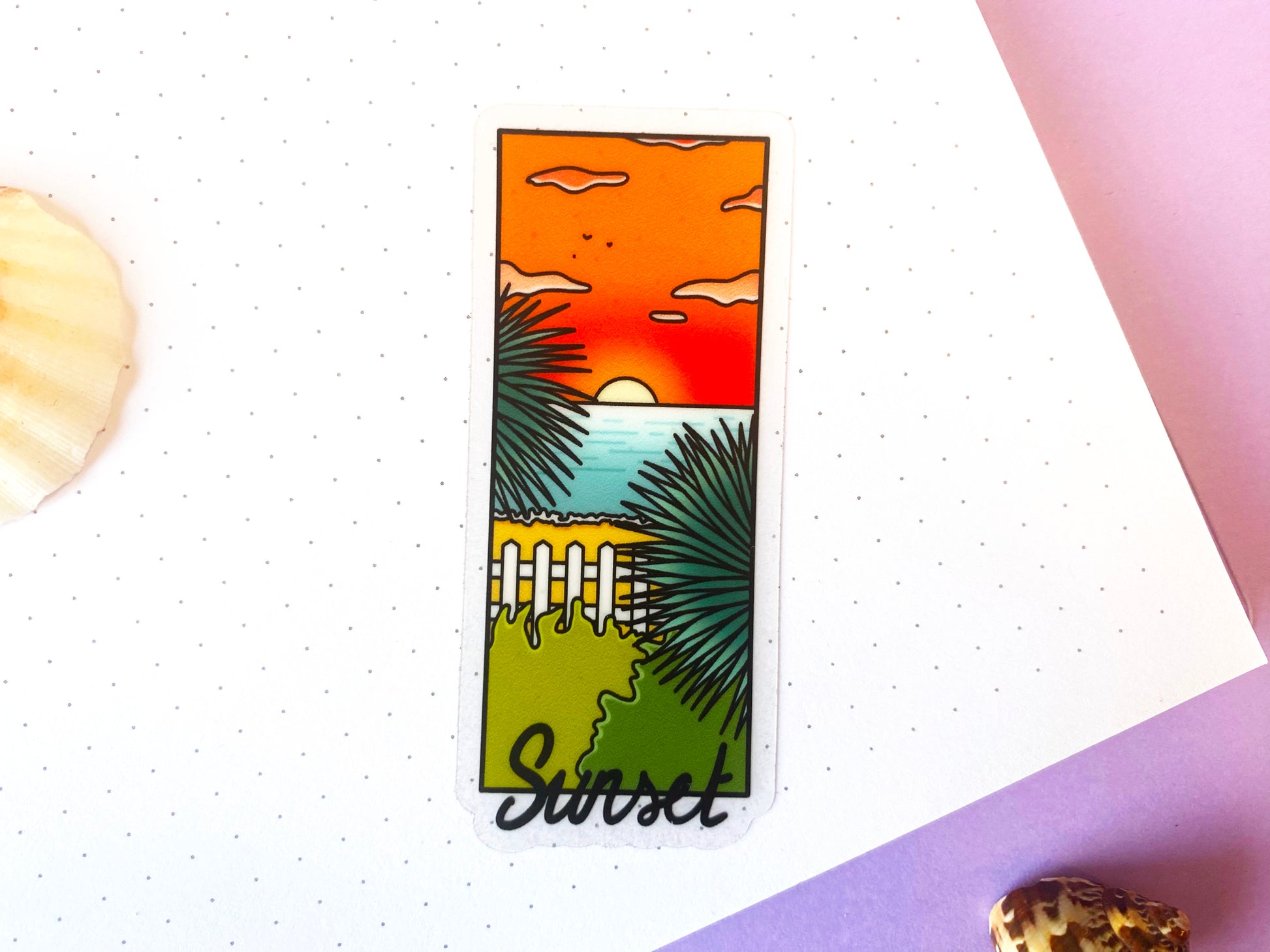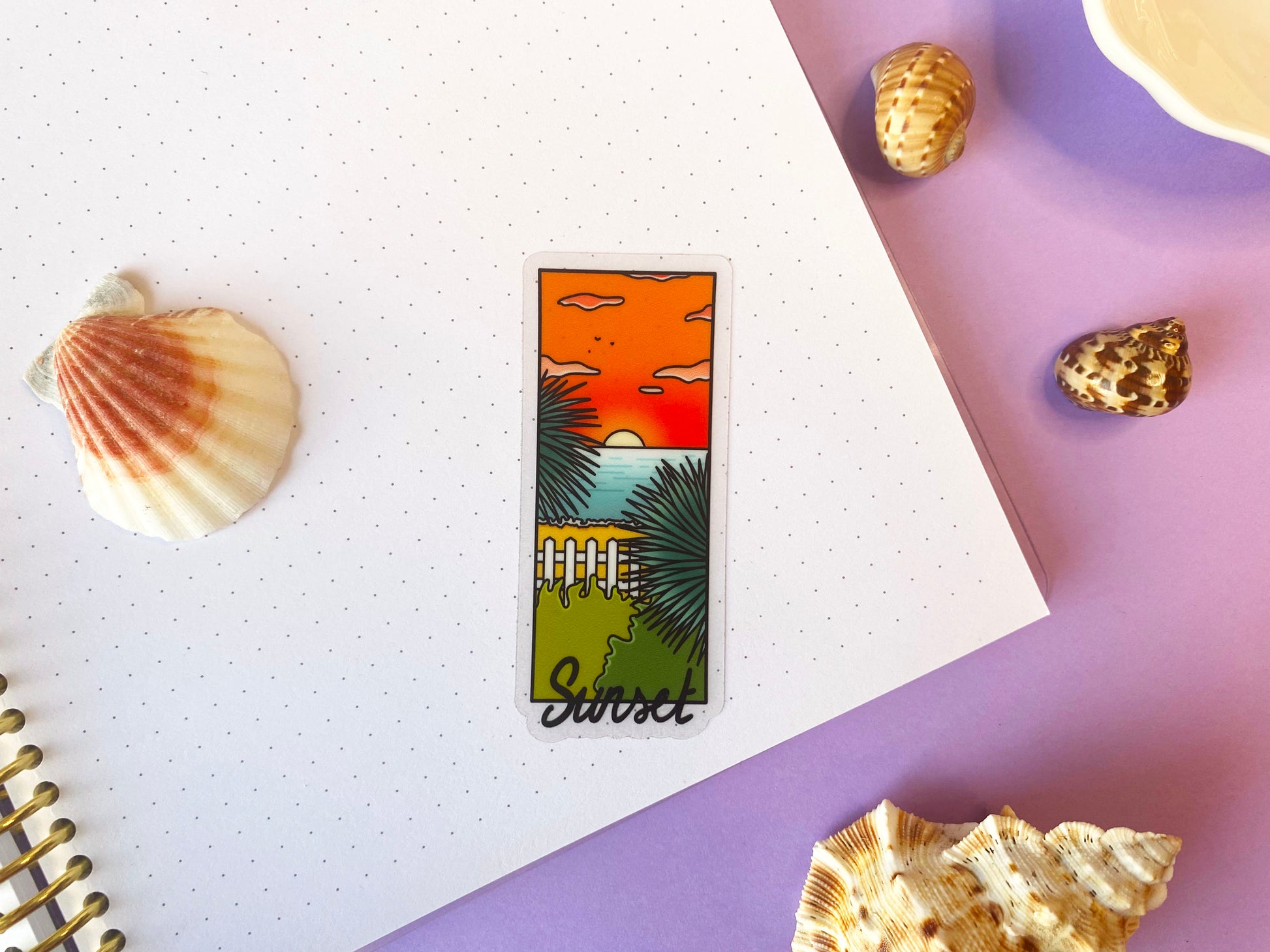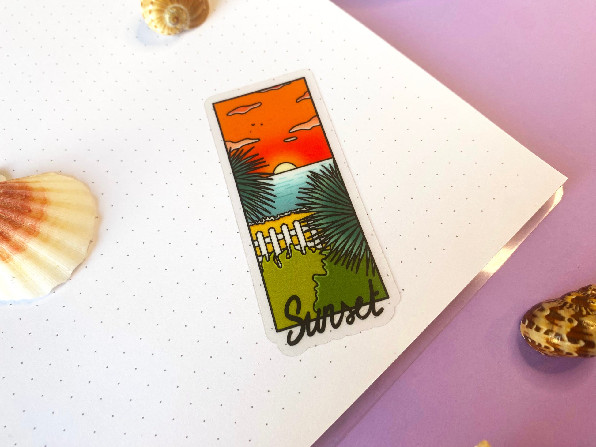 Transparent sticker "sunset". Greenery, a small hidden beach and an orange sunset.Waterproof, these stickers are suitable for phone, computer, notebook, etc. Possibility of repositioning them according to the surface.