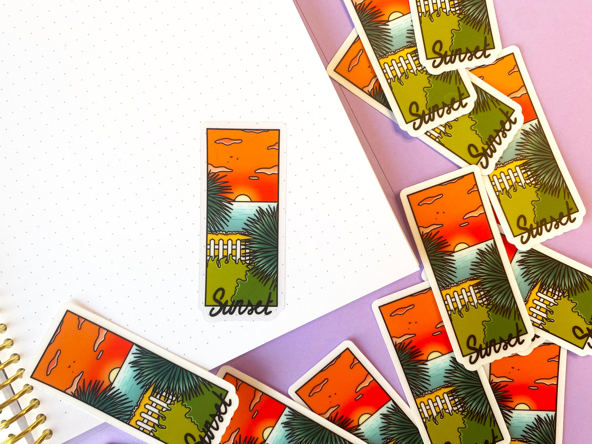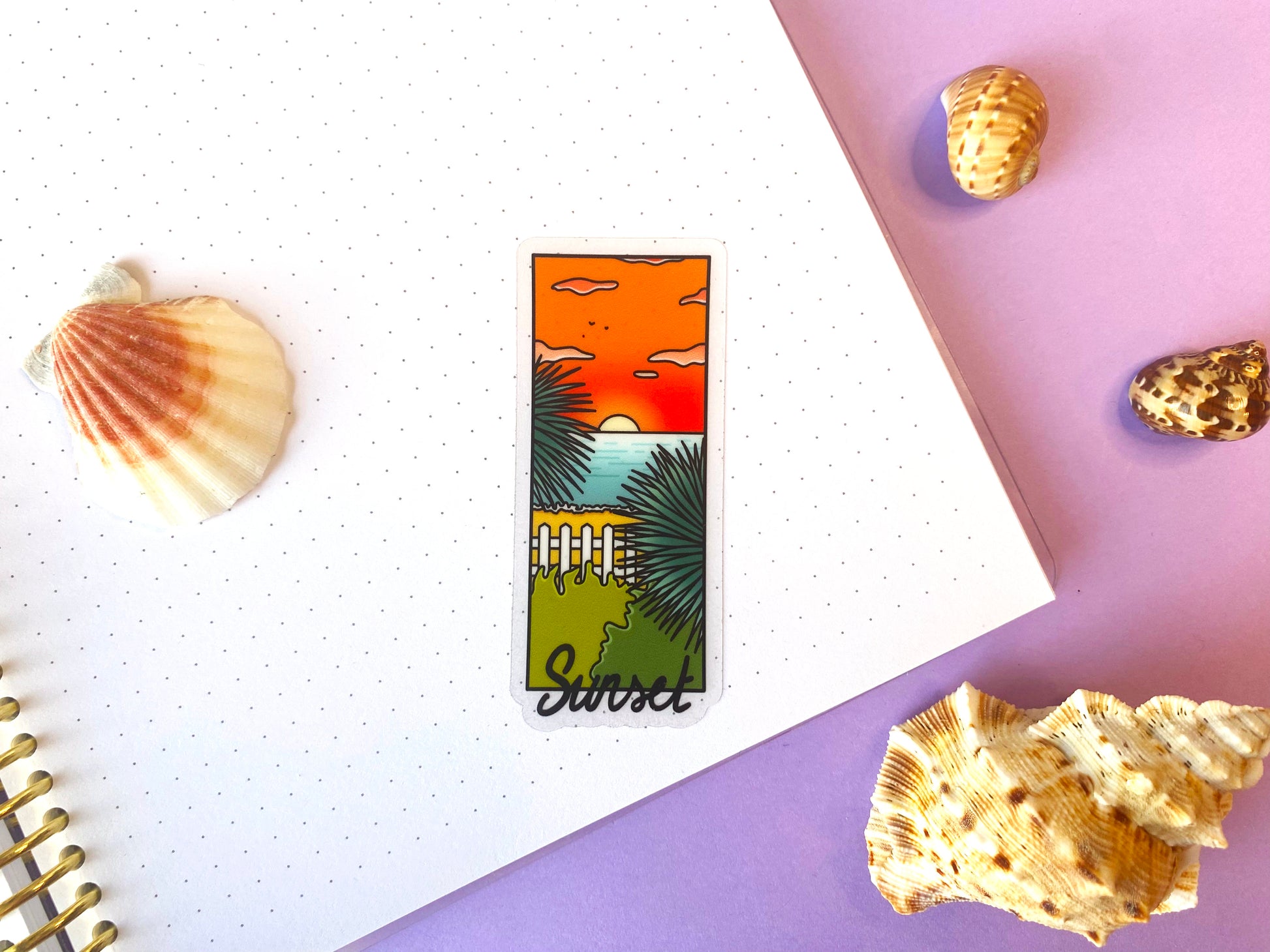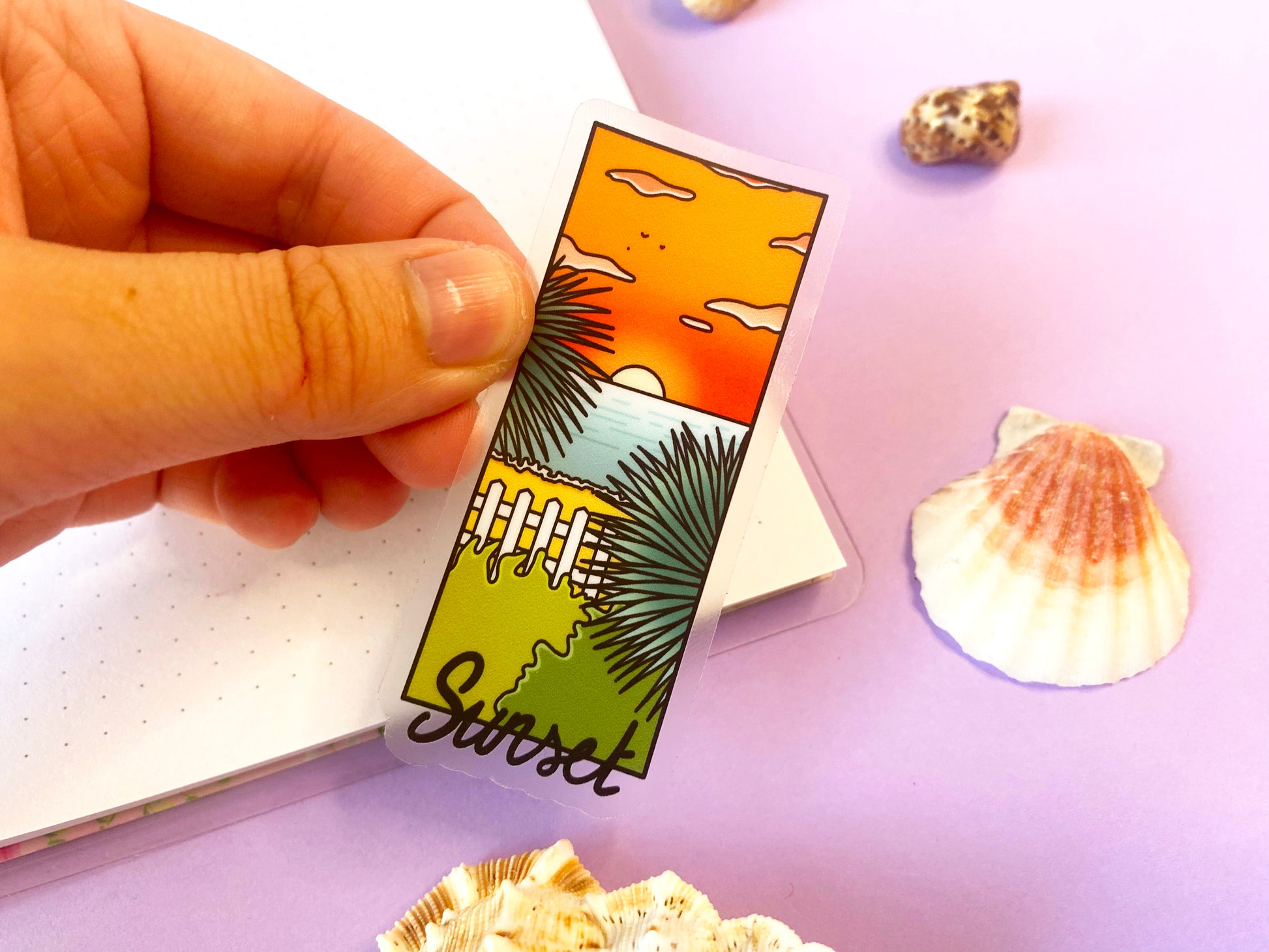 Transparent sticker "sunset". Greenery, a small hidden beach and an orange sunset.Waterproof, these stickers are suitable for phone, computer, notebook, etc. Possibility of repositioning them according to the surface.