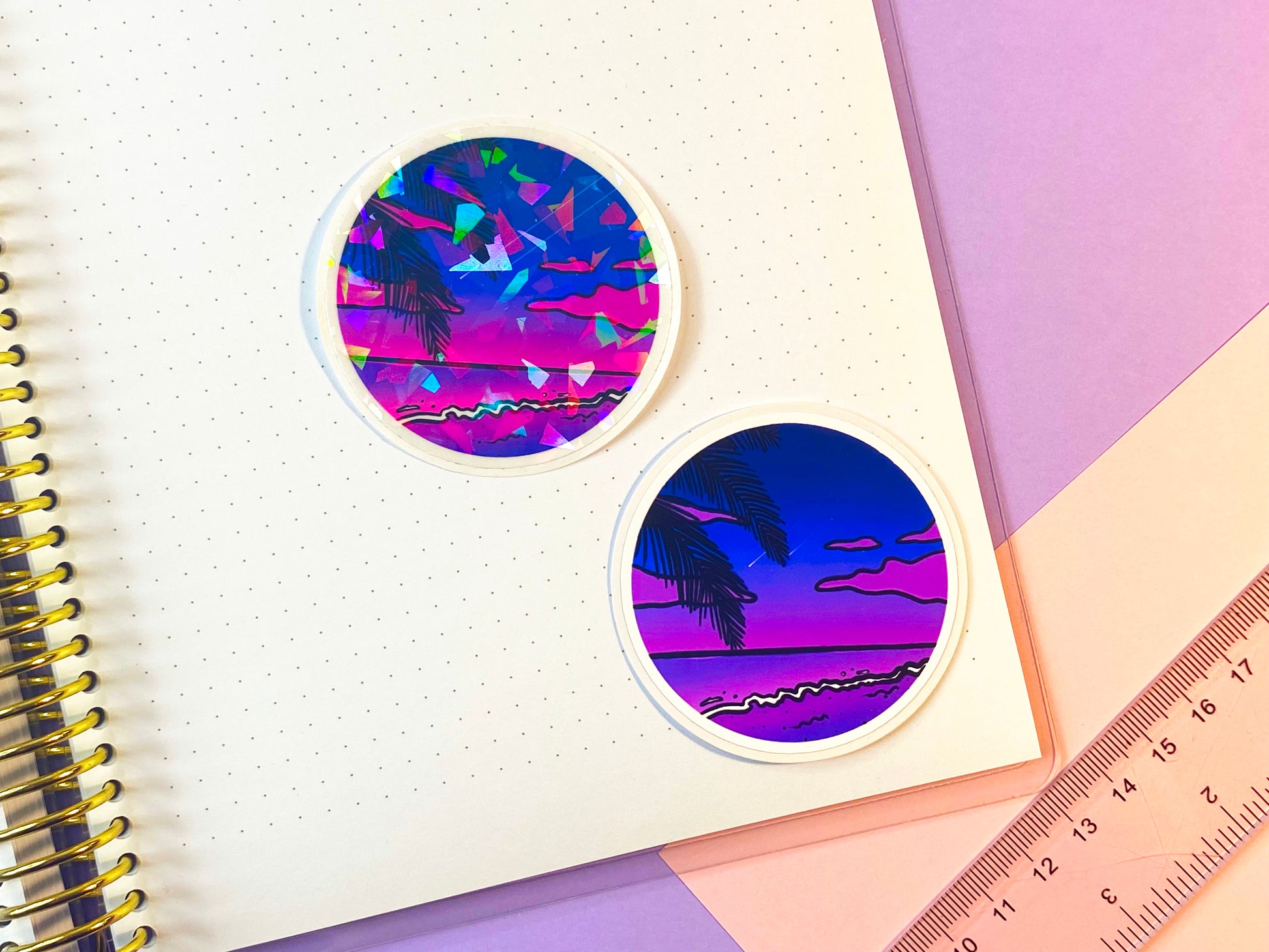 Sticker from the "Aesthetic circle" collection. This collection is made up of 3 emblematic vaporwave visuals from IhoomiArt Shop and are among the very first designs that I created during my first steps in the world of stationery.I designed this collection which captures 3 moments of a sweet end of a summer day: