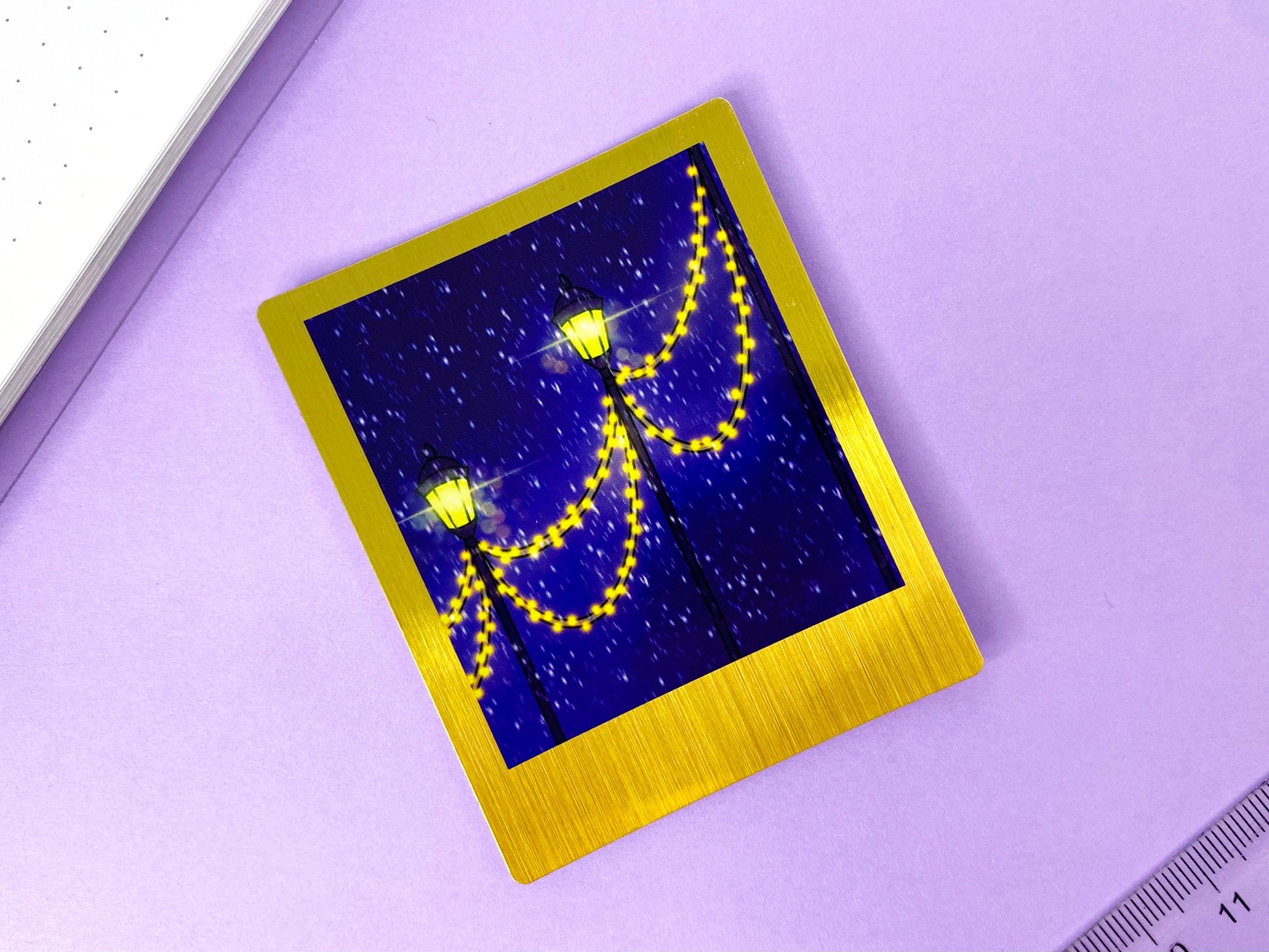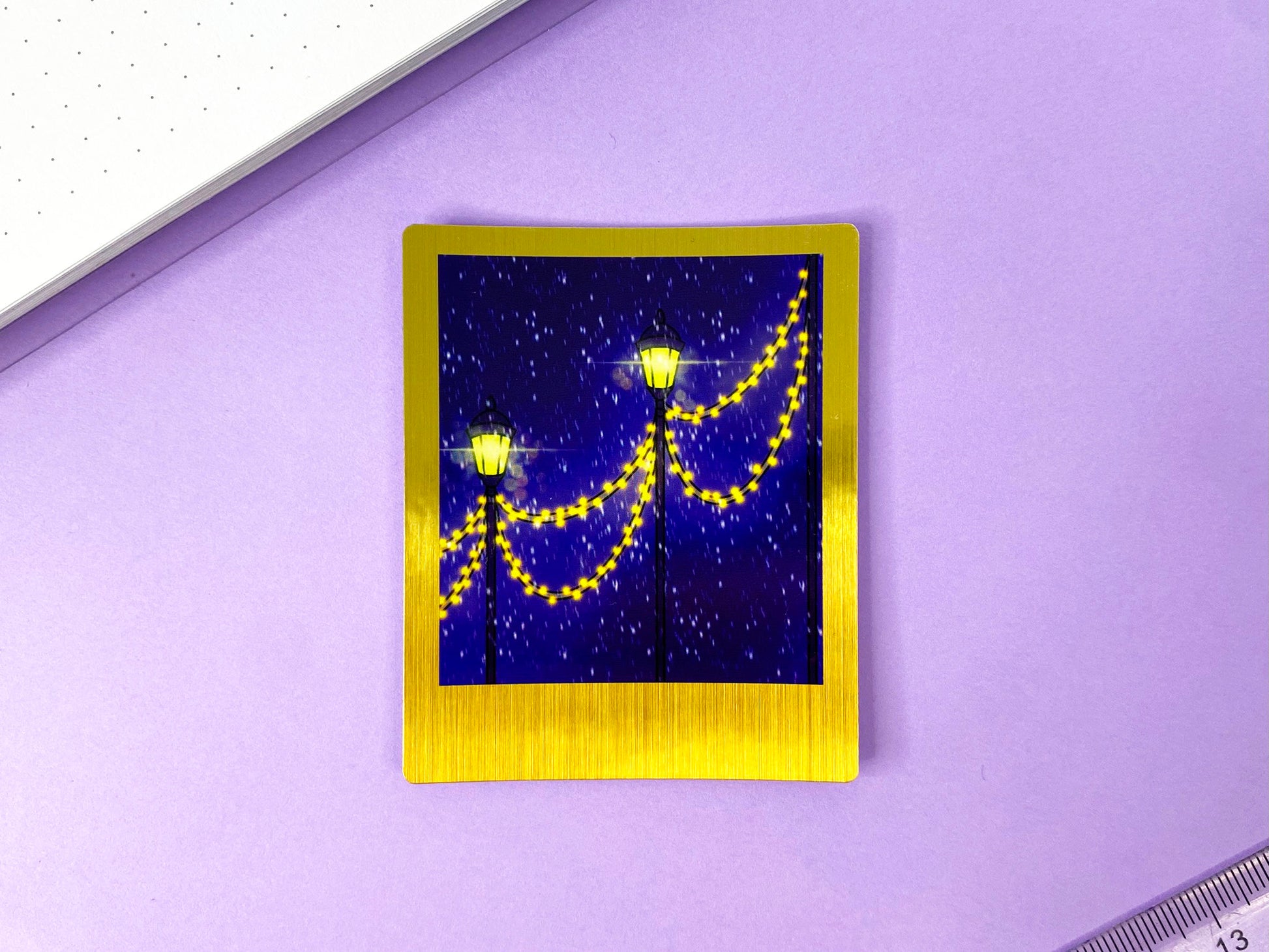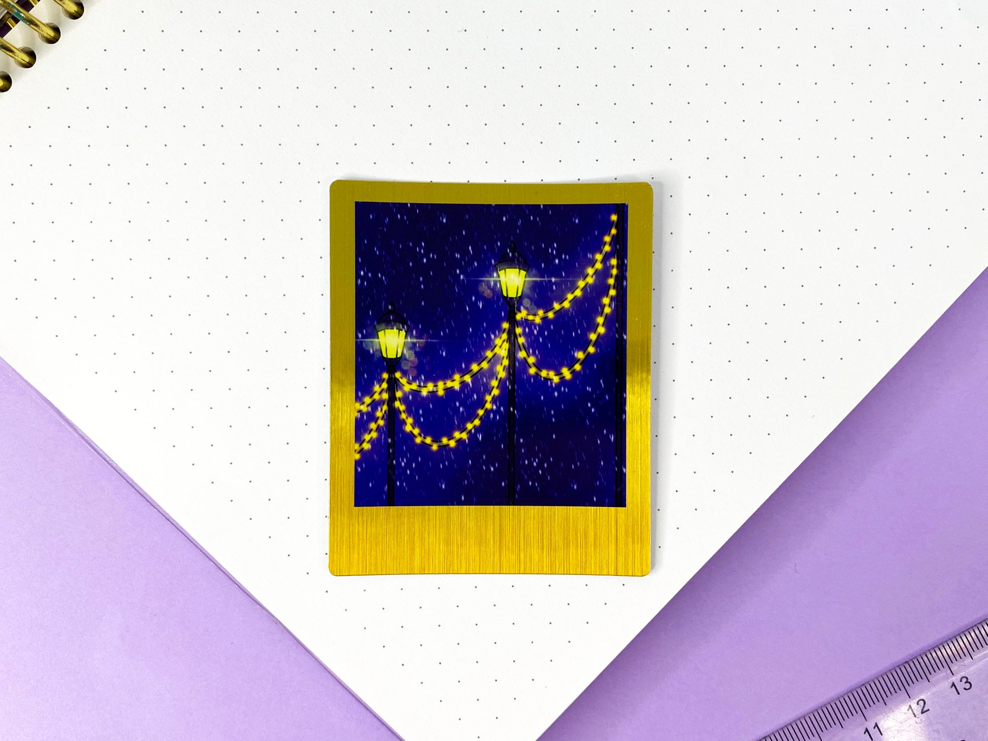 Stickers Polaroid Doré Thématique Before Christmas | Lumières de noël et nuit enneigé.