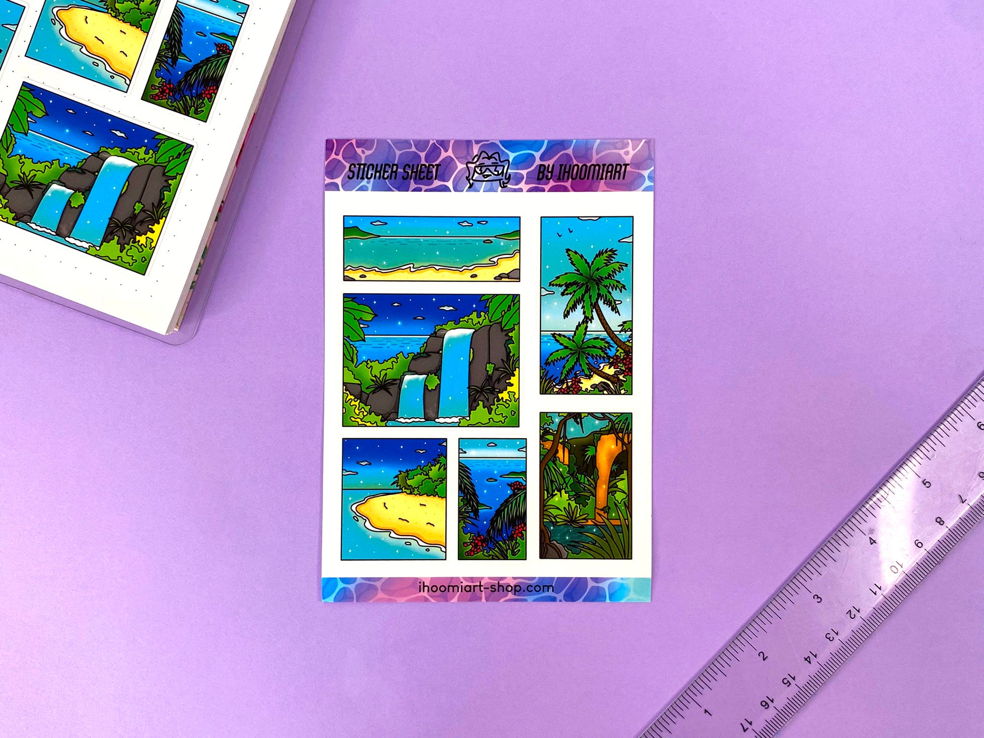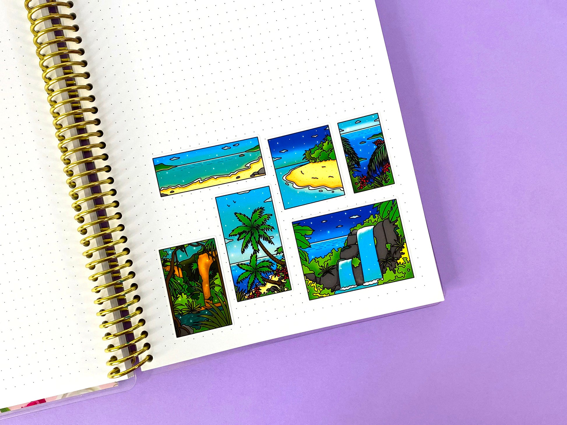 Tropical Exploration A6 Sticker Sheet | Island, jungle and ocean view